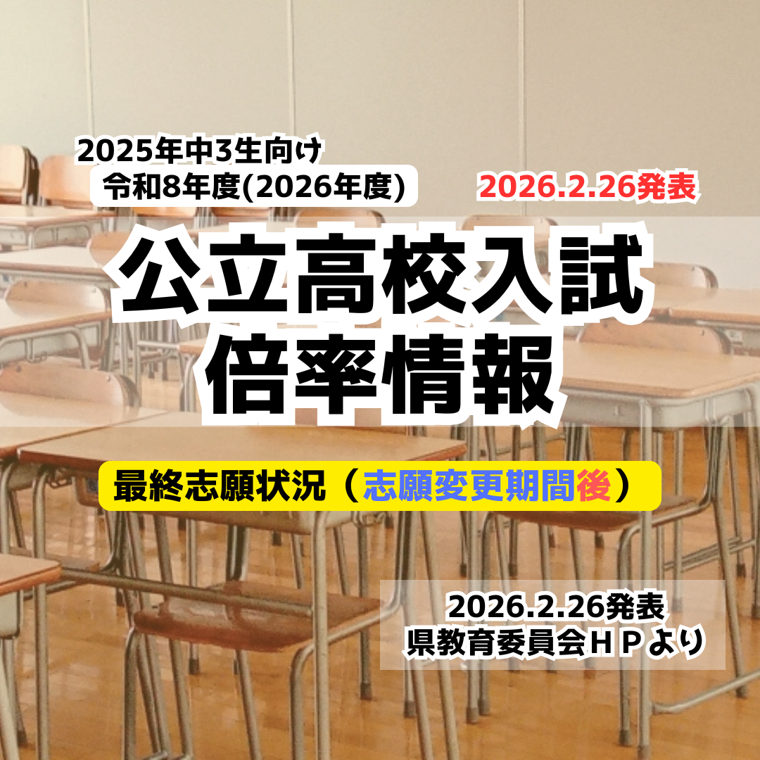 最新の倍率状況はこちらから【2026.2.26発表】【後期入試・最終倍率】令和8年度公立高校 2026年度入試…
