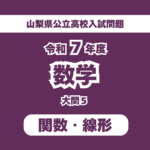 2026年1月30日 / 最終更新日時 : 2026年3月28日 LEAF 令和7年度(2025年度) 【過去問YN】R7(25)M5 山梨県公立高校入試 数学 大問5 関数線形 解答・解説は2ページ目にあります。(問題下のボタンより)PDFでダウンロードしたい方は下のボタンからダウンロードページにお進みください。 令和7年度 山梨県公立高等学校入学者選抜学力検査問題 数学 大問5 図1、2におい […]