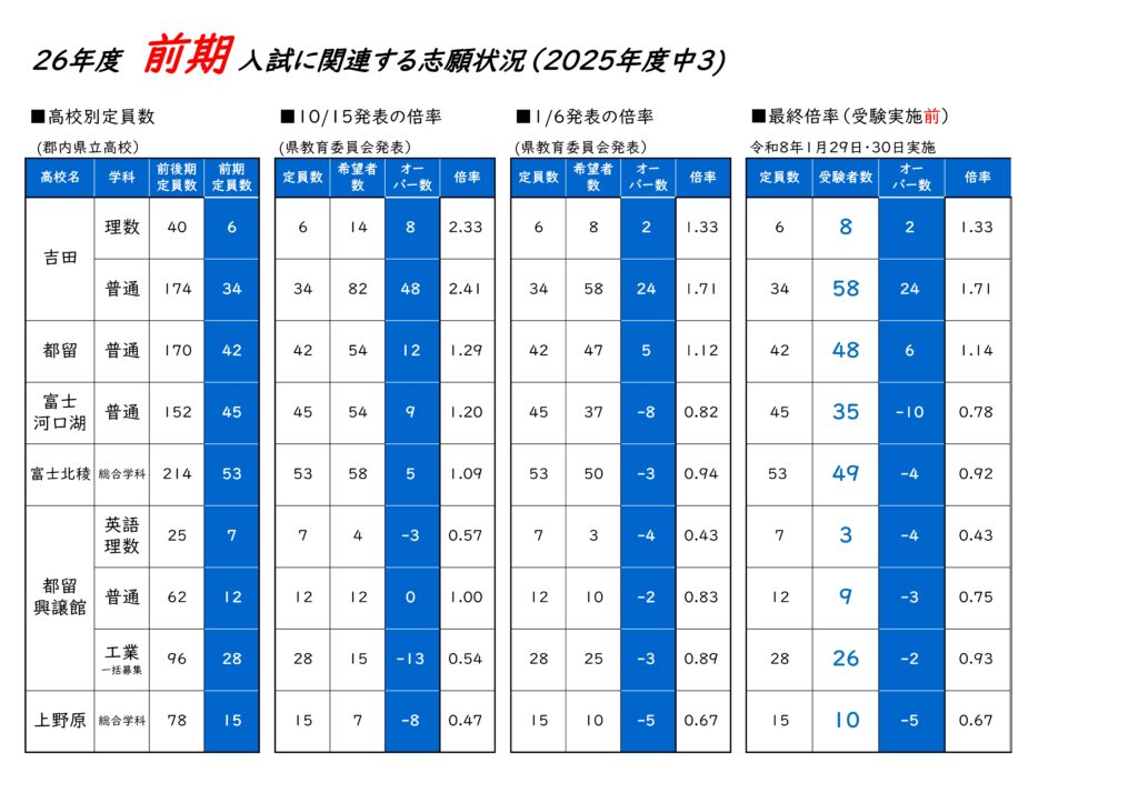 【前期入試倍率】令和8年度公立高校 2026年度入試(2025年度中3生) 前期入試最終倍率(山梨県公立高校入試倍率)