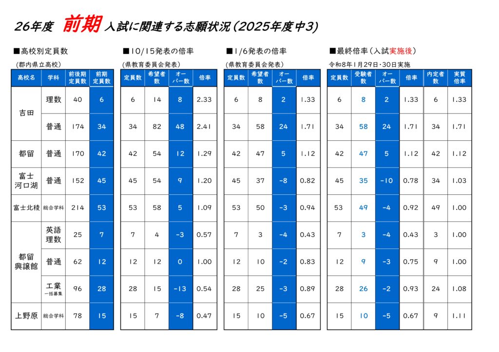 【後期入試倍率】令和8年度公立高校 2026年度入試(2025年度中3生) 後期入試志願者数(山梨県公立高校入試倍率)