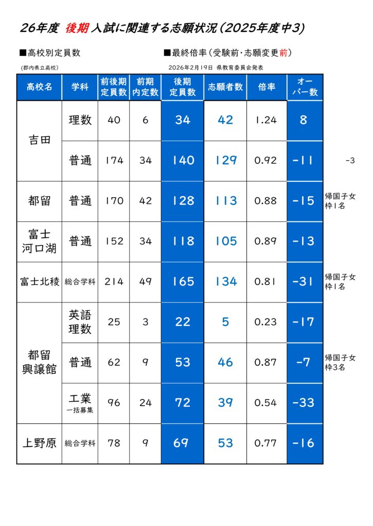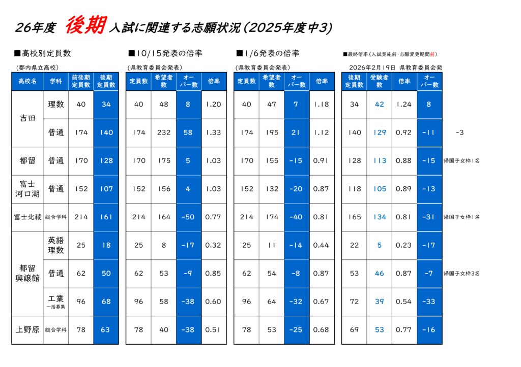 後期入試(倍率)志願変更【2026年2月19日発表】