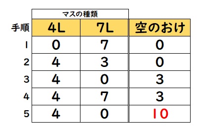 - 7Lの水のうち4Lのマスに4L移す(7Lのマスには3L残る)