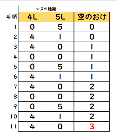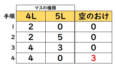 - 4Lのマスの水を5Lのマスに入れていき、5Lのマスを満杯にする(1Lの水が移動するので4Lのマスには3Lが残る)