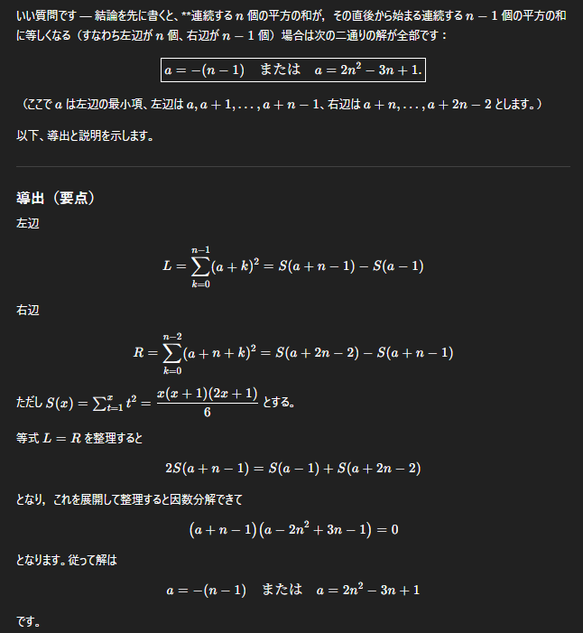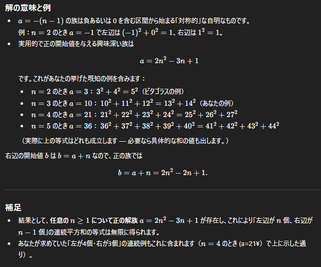 確認:10² + 11² + 12² = 13² + 14² 100 + 121 + 144 = 169 + 196 365 = 365 ✓