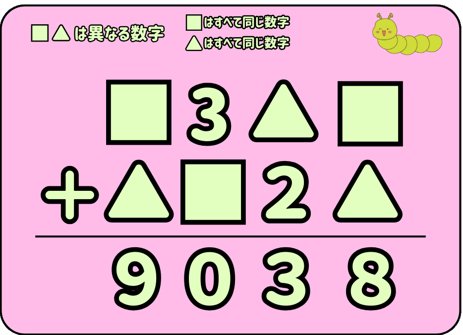 一の位の数は「□+△=8」となるのは、□・△=0・8 / 1・7 / 2・6 / 3・5 (□と△は入れかりOK)