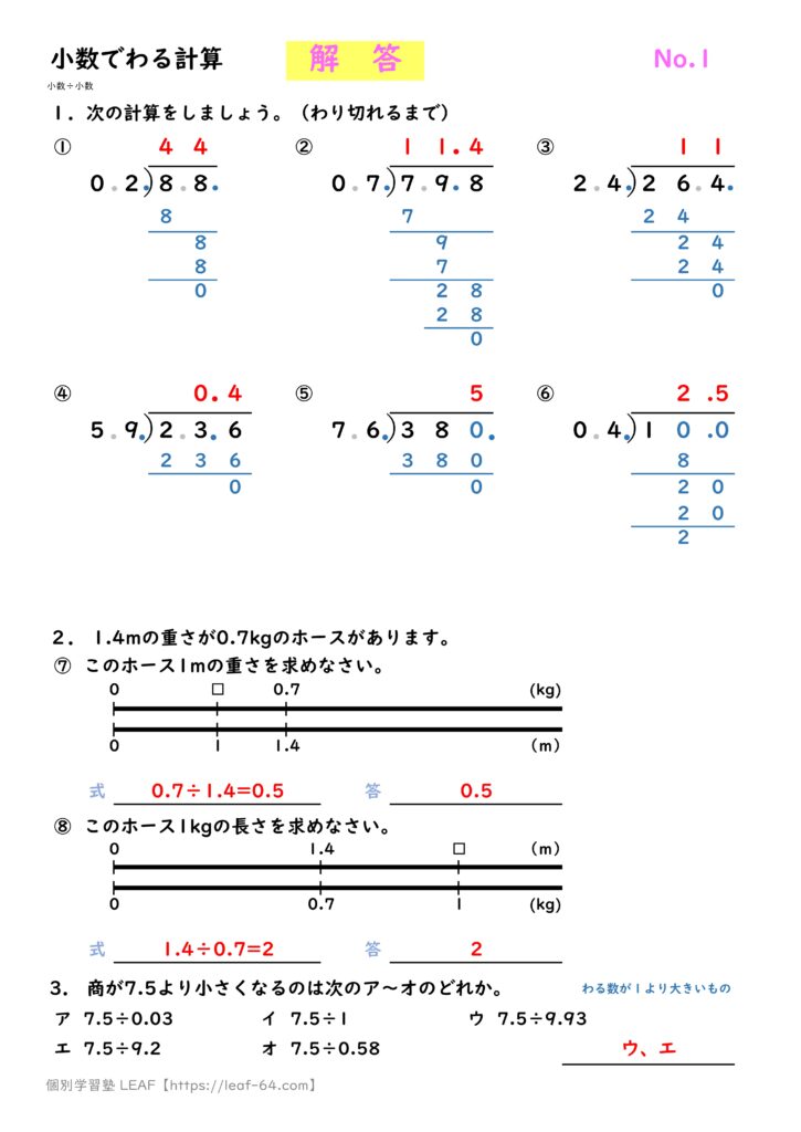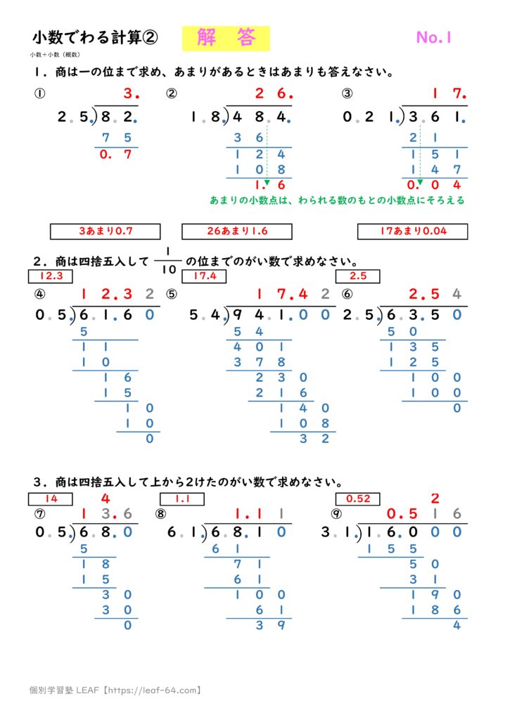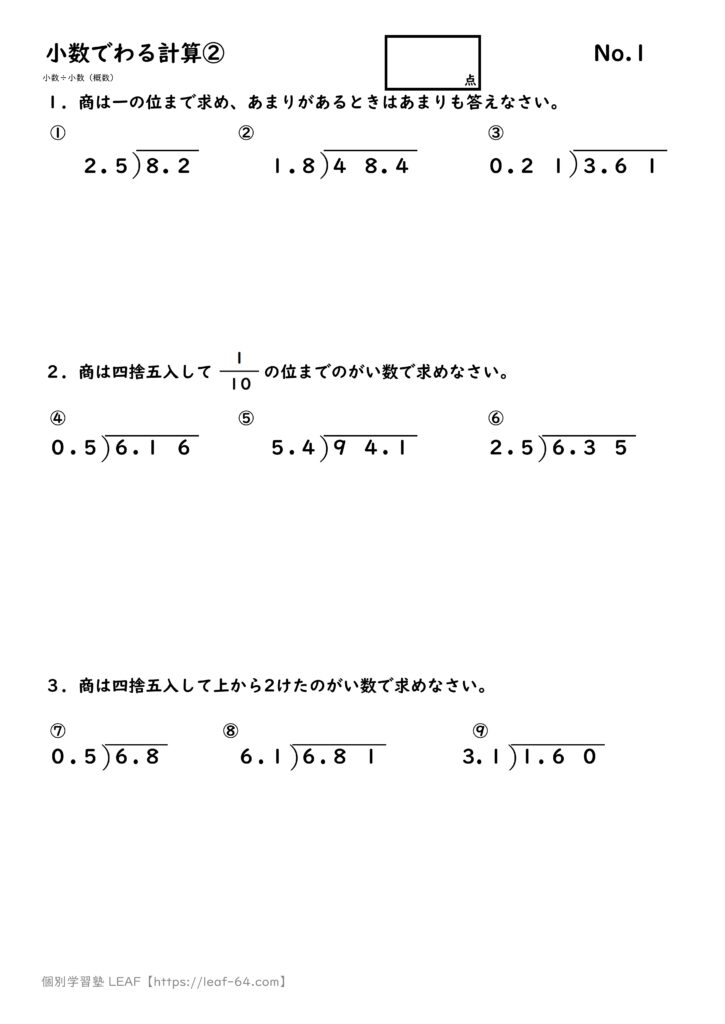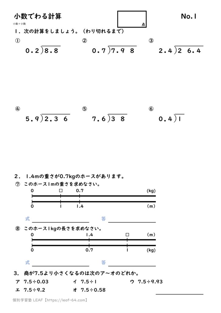 小数のかけ算とわり算(小数と小数)のプリントです。