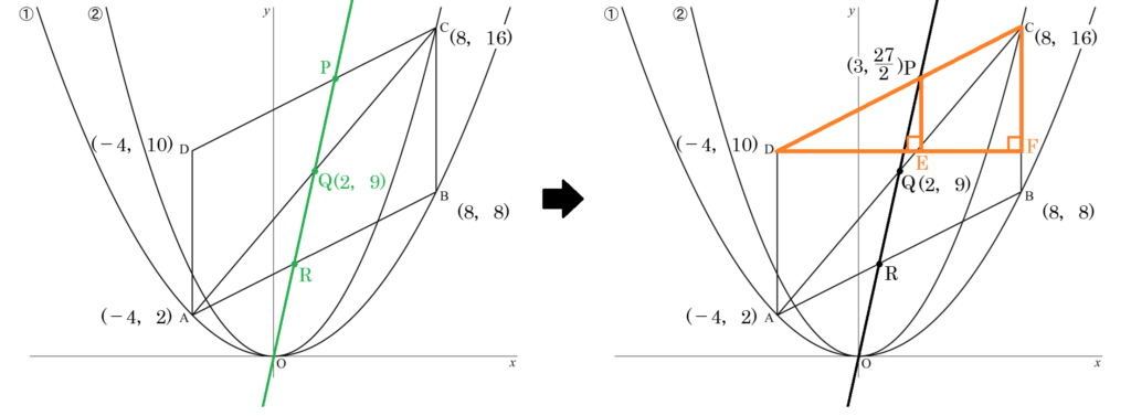 ACの中点は(2,9)なので、直線OPは (Qが中点になりますね)