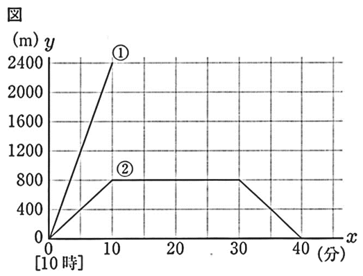 また、図の②は、弟が移動するようすについて、10時分の地点から自宅までの道のりを mとして、との関係を表したグラフである。